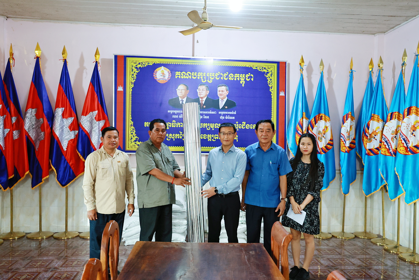 11月22日,西港特区公司副总经理刘连池代表公司向西哈努克省波雷诺县牛脚乡政府捐赠了200张盖屋铁皮,用于帮助受台风影响的村民重建家园,牛脚乡人民党副主席CHHENG SETH代表灾民接受捐赠。