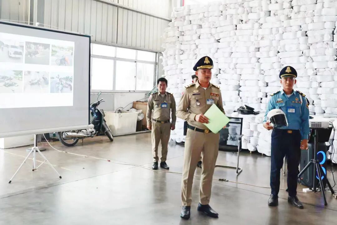 为提升西哈努克港经济特区内全体员工的交通安全意识,有效预防和减少交通事故,在西港特区公司的邀请下,9月15日,磅逊港市警察局局长索利纳上校率团走进区内的柬埔寨高点木业有限公司和卓尔家纺(柬埔寨)有限公司两家企业,正式开启“交通安全进企业”宣讲活动,当天约有750名工人参加了活动。