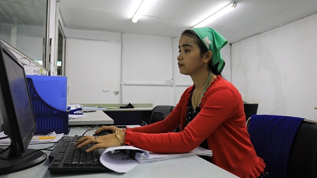 目前,林雅达所做的工作用厂长钱志平的话说就是“能胜任这个工作的柬埔寨人只有林雅达”。跟别的女工每天在缝纫机前忙不停不同,林雅达的工作是打版,就是在电脑上操作打版软件,安排计划每天的布料裁剪。来到林雅达工作的小隔间,打印机正在“吱吱”地工作,她正专注地看着电脑,在电脑上熟练地操作着打版软件。林雅达接触学习这项技术活还不到一年的时间,但是操作已经很熟练了,旁边的中国师傅都夸她“脑子活,学得快,肯学肯干”。印证他们这一说法的还有林雅达流利的中文水平。“她是在我们厂里的中文班学的中文,学了很短时间,但是一直跟工厂的中国师傅交流、接触,自然讲得好。她愿意学,我们就愿意教,中文是这样,技术也是。”钱志平说。