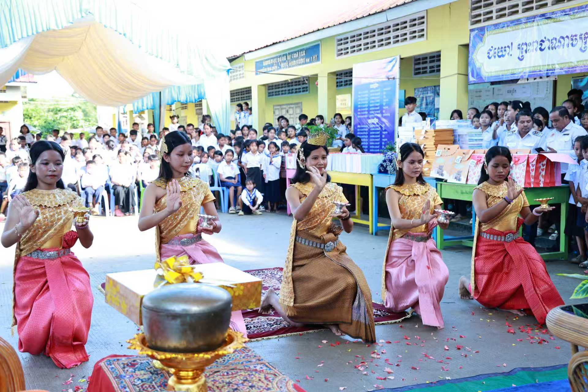 开学典礼在庄严的诵经仪式中拉开帷幕,随后全体师生肃立,齐唱柬埔寨国歌。伴随着悠扬的音乐,几名学生身着传统服饰,手捧象征祝福的花瓣踏歌而来,优雅的舞姿不仅展示着柬埔寨的传统文化,同时也展现出了江苏-西哈努克默德朗友好学校蓬勃向上的精神风貌。
